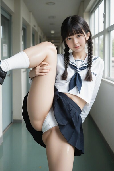 長く伸びる影が床を染める午後、誰もいない廊下で彼女の端正な三つ編みが小さく跳ねた。規律を象徴する制服の裾が、重力に逆らうようにして高く、優雅に翻る。その先に露わになったのは、少女の幼さを否定するような、肌を締め付ける薄い布の曲線。垂直に伸びた脚のラインと、静寂の中に響く衣擦れの音が、日常の通路を異質な空間へと変質させていく。規則正しく編み込まれた髪とは対照的な、無防備に晒された秘部が、傾いた西日に…